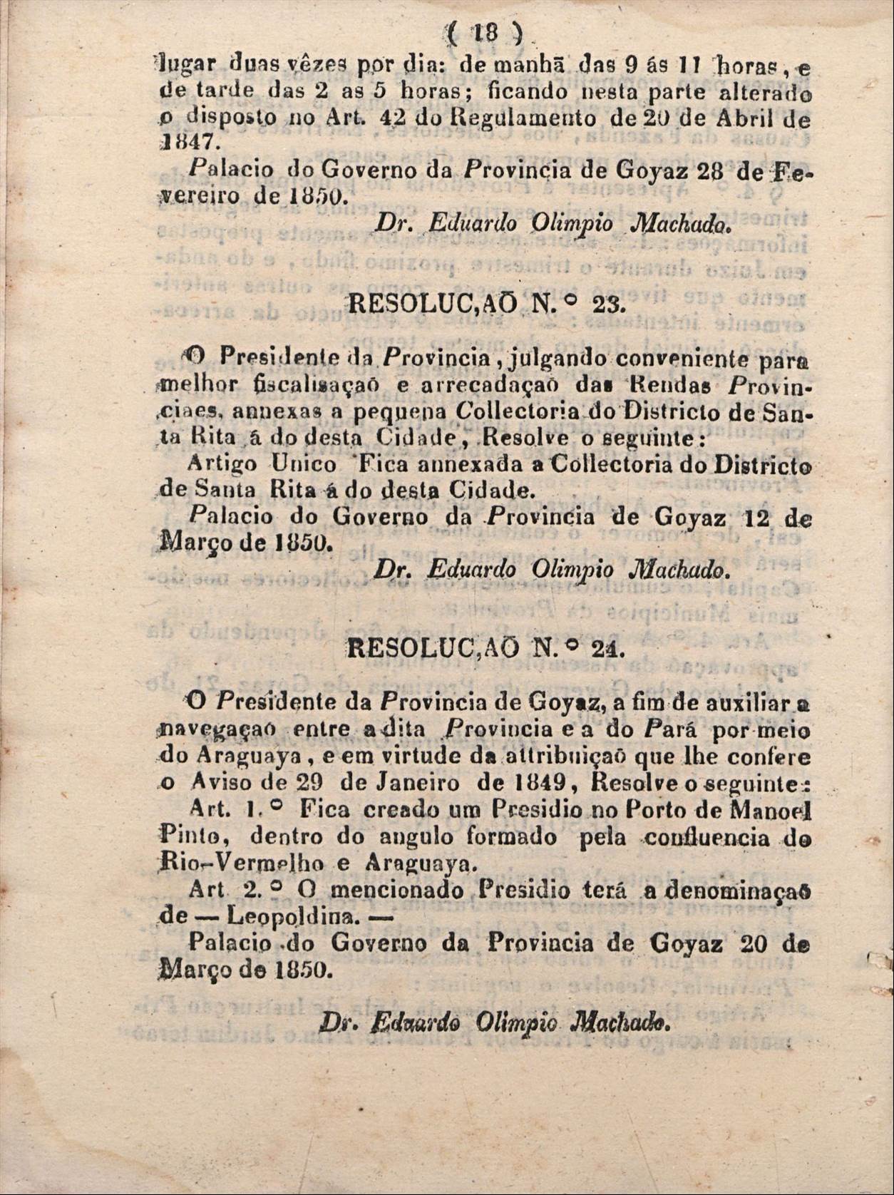 Criação do Presídio Leopoldina, através da Resolução nº 24 de março de 1850.RESOLUÇÃO nº 24 de 20 de março de 1850, do Governador da Província de Goyaz, Eduardo Olímpio Machado, cria o Presídio Leopoldina, em atendimento ao Aviso Imperial de 29 de março de 1849.