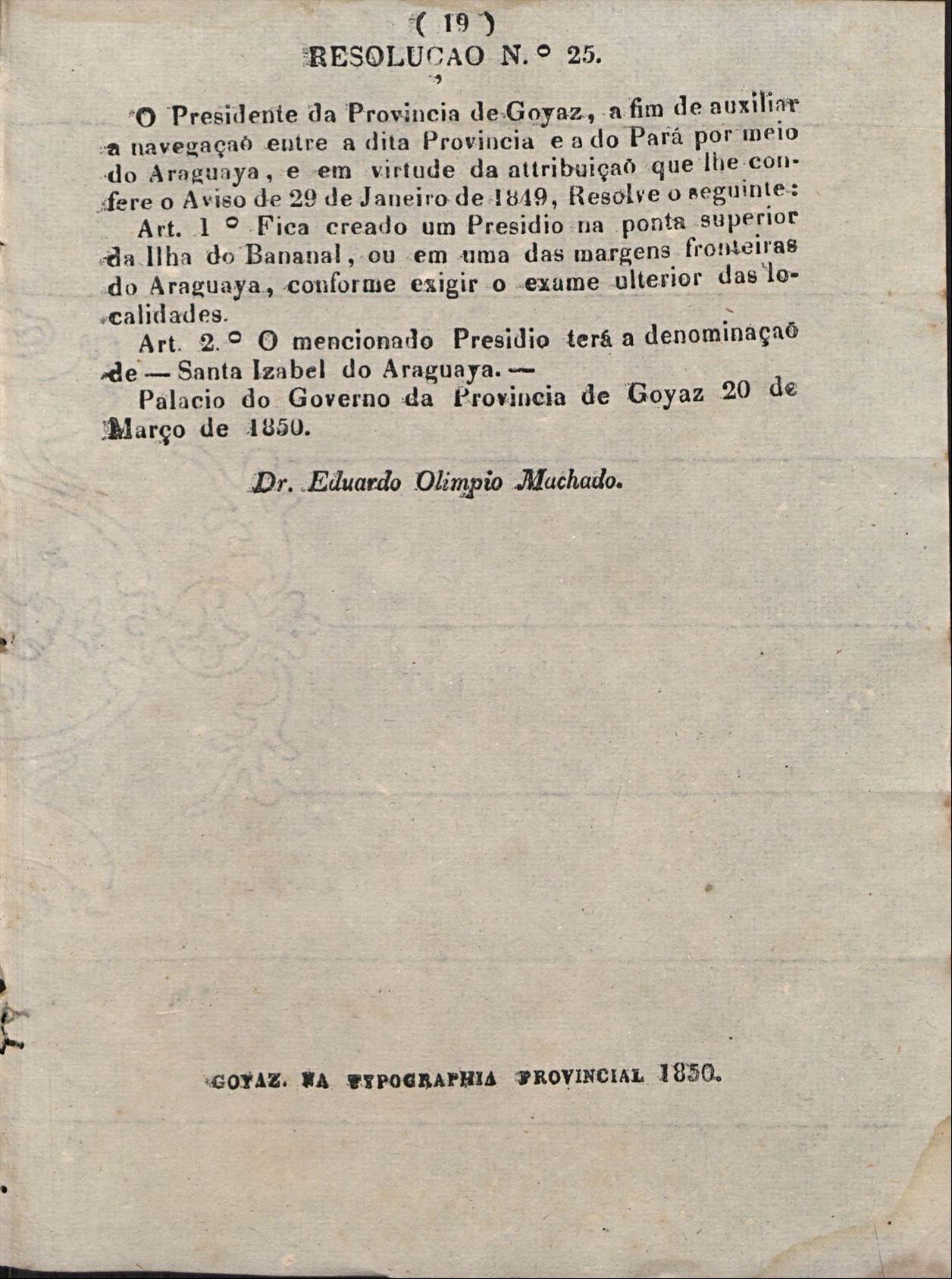 RESOLUÇÃO nº 25 de 20 de março de 1850, do Governador da Província de Goyaz, Eduardo Olímpio Machado, cria o Presídio de Santa Izabel, em atendimento ao Aviso Imperial de 29 de março de 1849.